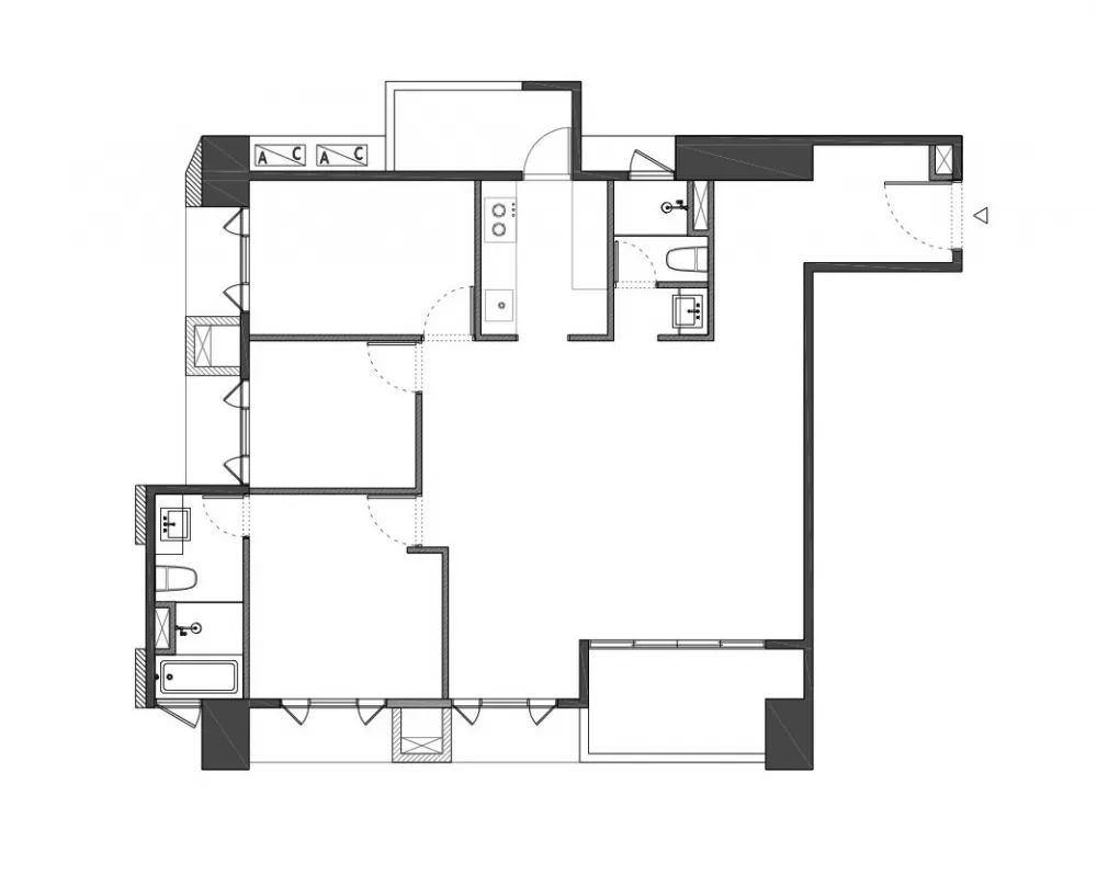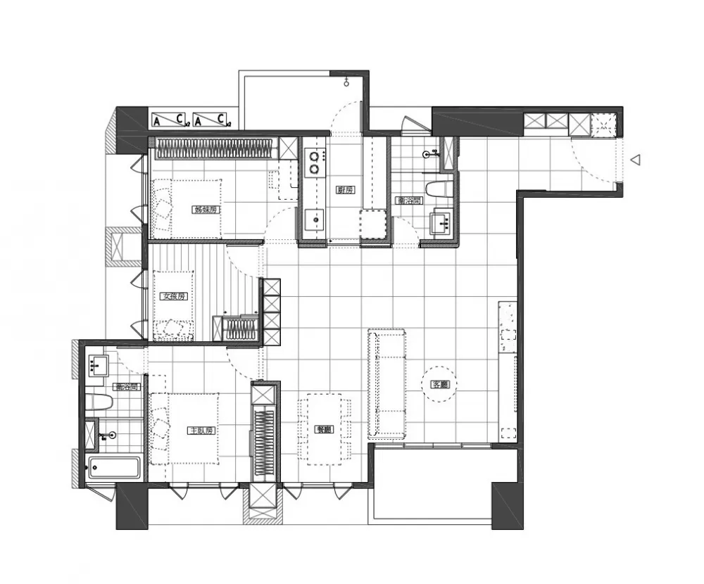 為了中間廚房的玻璃拉門設計,將右側客浴和左側姐妹房的入口都往前設置,以整合牆面的平整性與視覺上的俐落美觀。