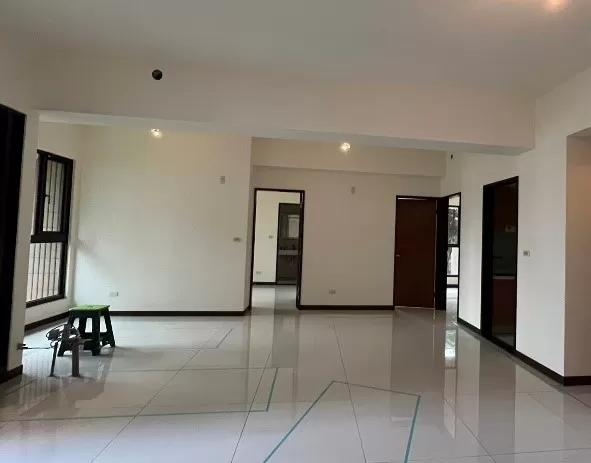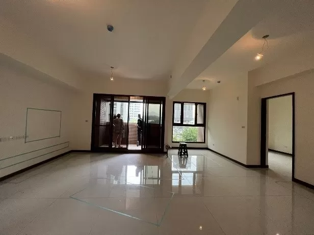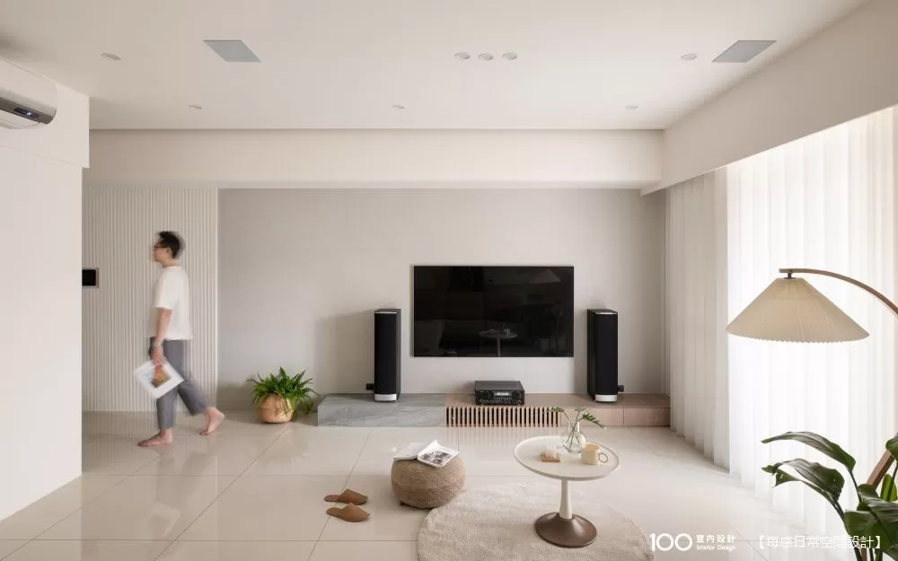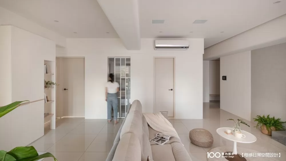 全宅大樑皆不刻意隱藏,並以平釘天花板保留最大空間感,營造出公領域的開放、明亮。地板為原有的拋光石英磚,家人們喜歡打赤腳但感覺冰冷,因此透過牆面色彩和木皮增添溫暖氛圍。