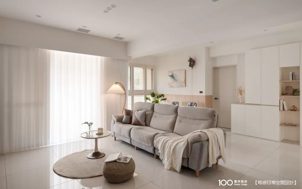 此建案在格局及管線上符合業主需求、不更動,在風格設計上,為彙整家庭成員們的想法,溝通過程約歷時四個月,動工至完工是三個月。透過整合長輩偏好的傳統路線、大女兒的簡約風及二女兒的柔美韓風,公共區域主打簡約具有開闊、敞亮感的溫馨風格,在私領域則融入各自的喜好,形塑出個別場域特色、綜觀來看亦保有最佳相容度的空間和諧狀態。接下來針對家中的各個空間,帶領大家一起來看看吧!