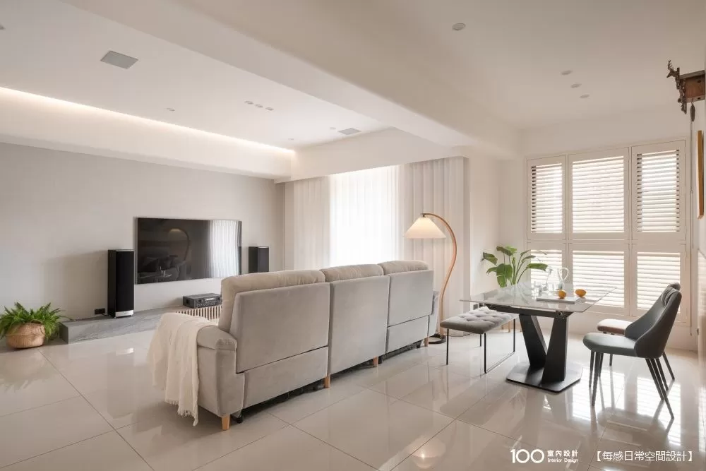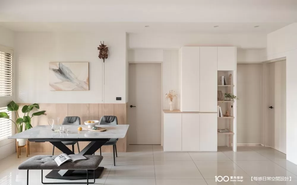 客、餐廳採開放式設定,餐桌規劃在沙發後方,讓父親從主臥走出來較近,一側的收納櫃特別在側面規劃圓弧鏤空造型,讓女兒們從房門走出時看到的是展示面、而非一堵櫃體,減輕量體帶來的壓迫感;壁面的木紋元素搭配木百葉窗,陽光灑落的悠閒寫意用餐情境油然而生。