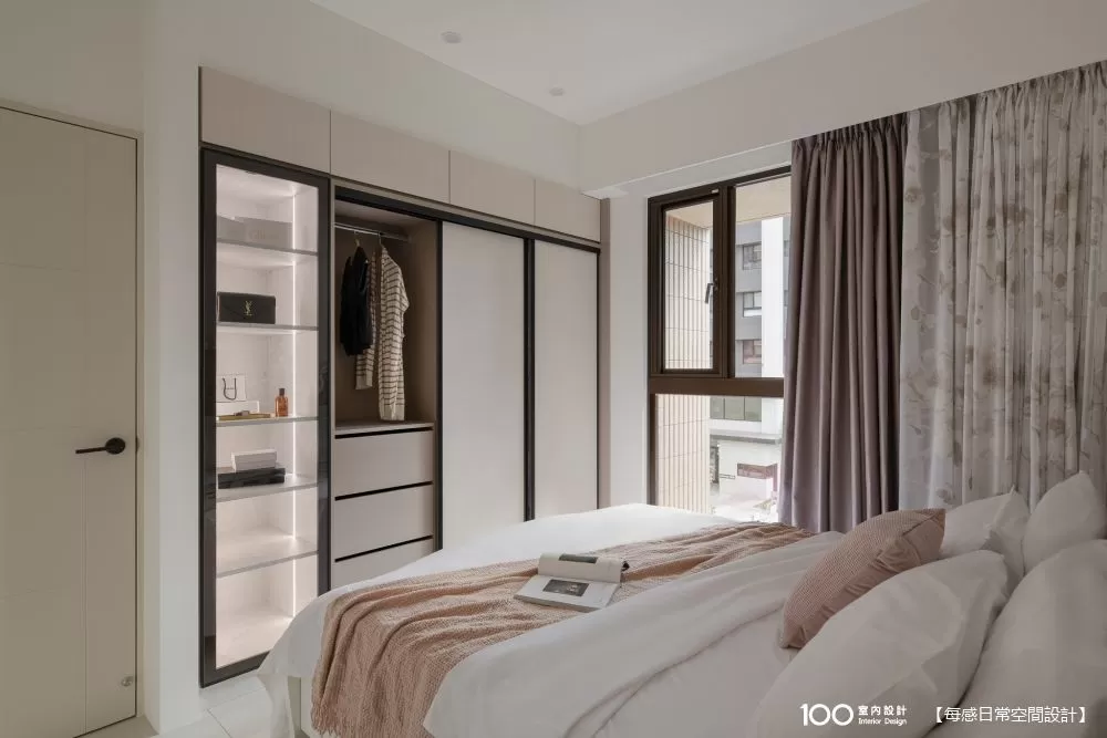 私領域主臥延續公領域的色系呈現,點綴黑框及線燈等現代元素,衣櫃深度約65公分,展示櫃提供陳列包包與珍藏品,家飾軟裝等順應長輩的喜好。