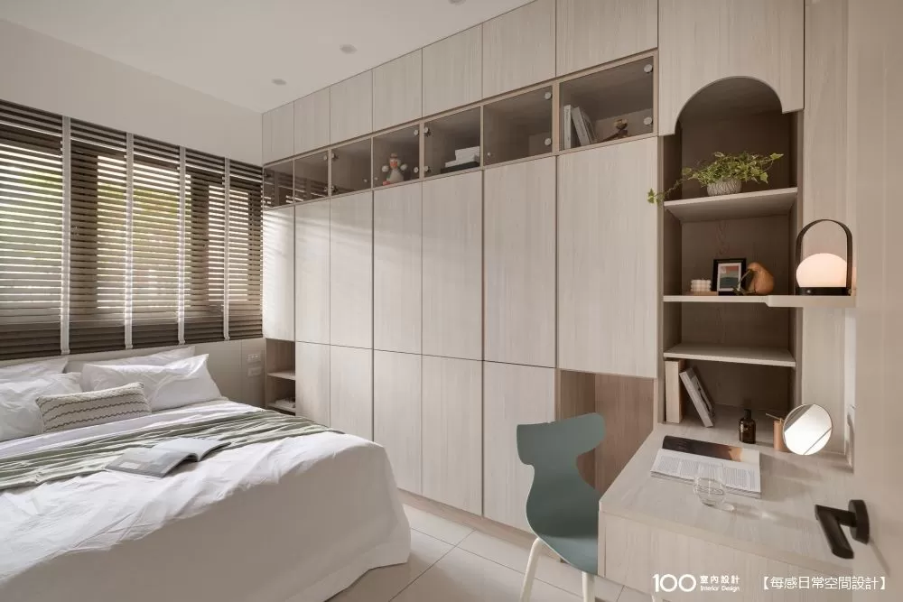 姐妹房為大女兒和小女兒的房間,以溫潤木色為主視覺,深度約60公分的全牆衣櫃納入玻璃展示區,滿足兩人收納與收藏品的展示需求,書桌面延伸、擴充使用面積,發揮空間最大坪效。