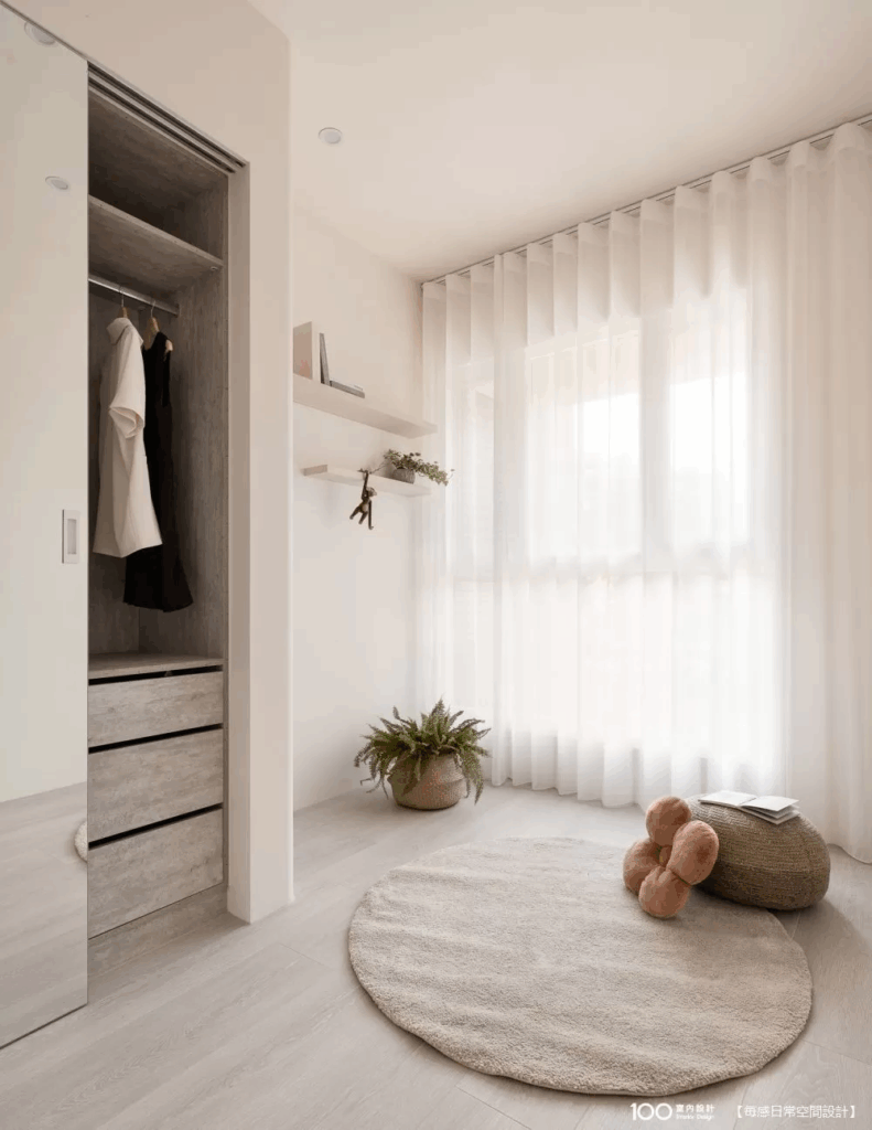 女孩房為二女兒的臥室,喜愛韓系柔美風格的她,首先要有大面紗窗且不須裝布簾,為了優美的浪漫感覺願意戴眼罩入眠,其次是衣櫃門板設置全鏡面,因應跳爵士舞的練習需求,而深度約68公分的櫃體側面採粉色系,滿足女孩的夢幻臥室想像。