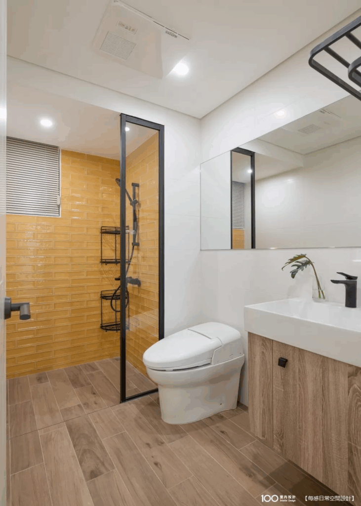 原始客廁將洗手台置於外面、不符使用需求,因此重新規劃納入改善,並透過深木紋磚打底,搭配跳色的橘色鐵道磚,乾區則採取純白色,於製造空間景深、視覺放大的效果上,更添增鮮豔活潑感覺。