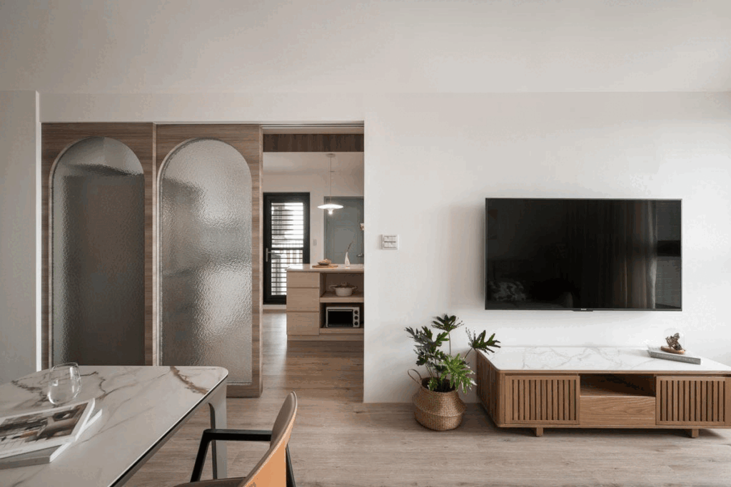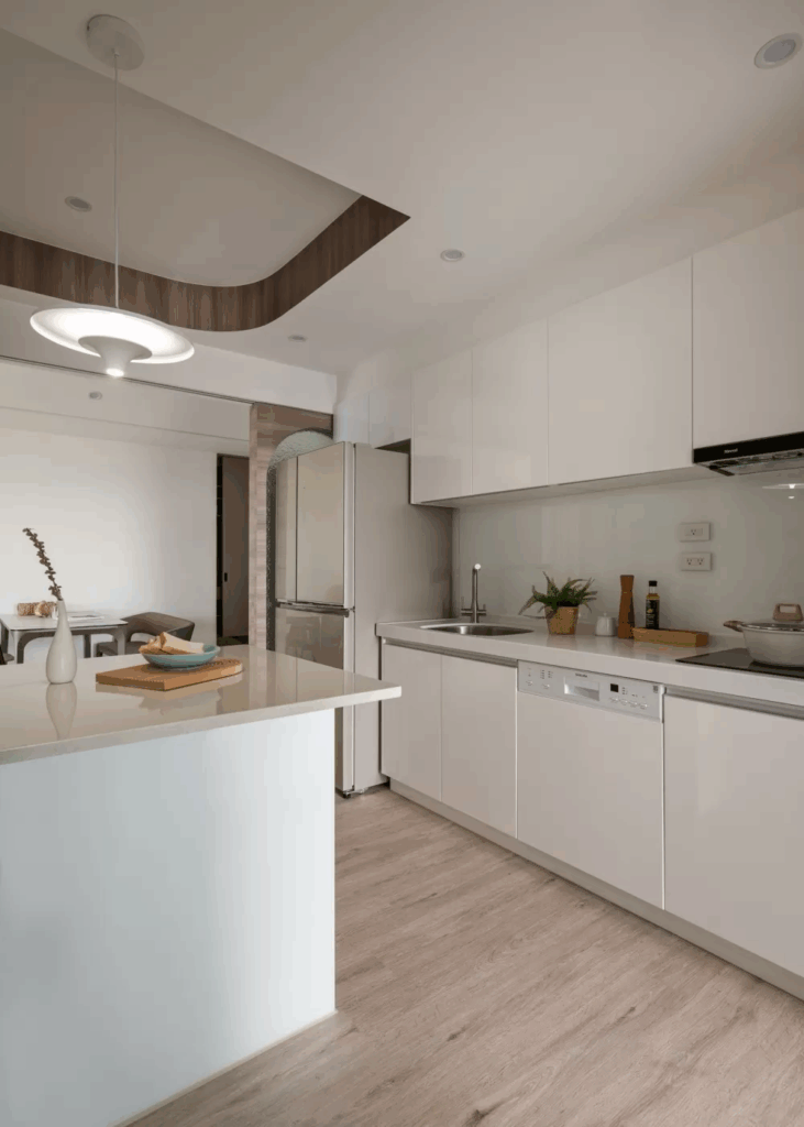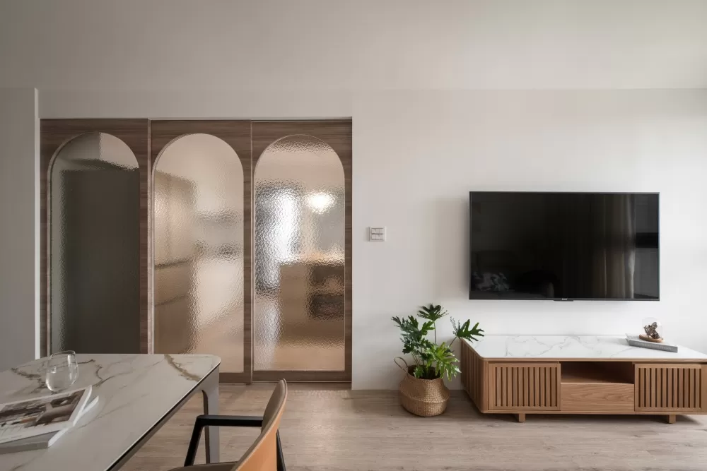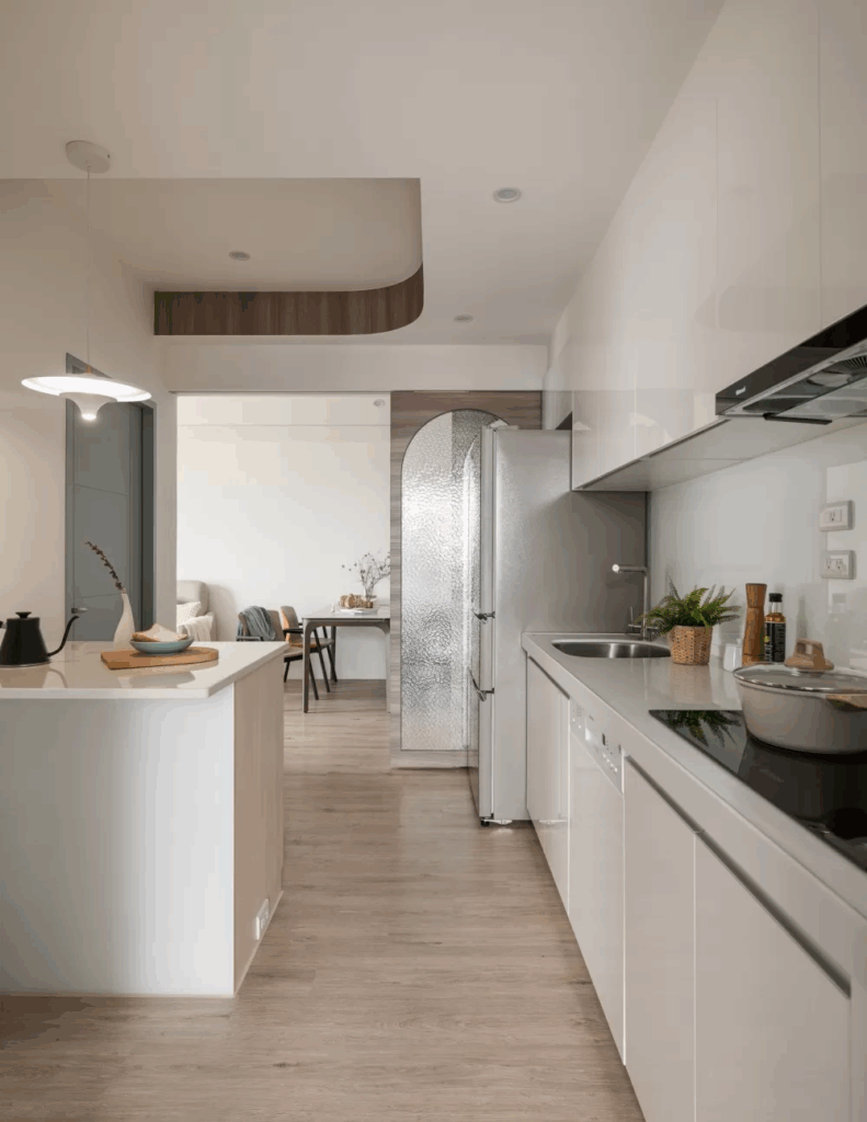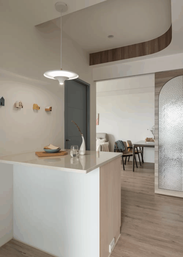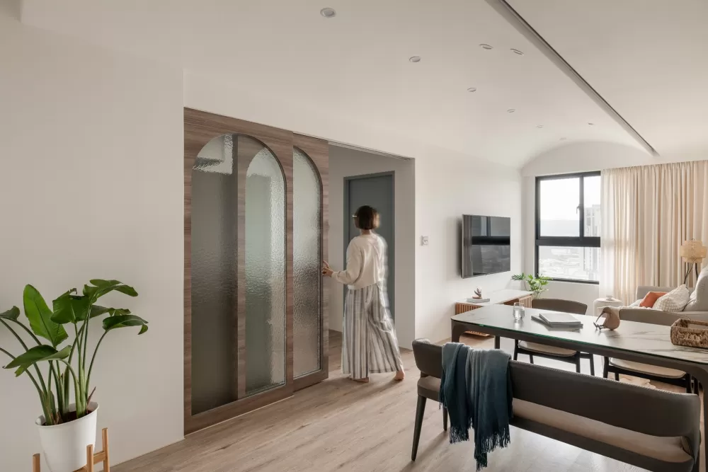 廚房位於餐廳拉門的另一側,這裡用古樸的水波紋玻璃搭配拱形門框,創造透光不透視的輕盈效果,連動式的滑門附有安全緩衝,使用時不致衝撞,由於軌道溝槽置於上方,地面無接縫,進出打掃不受影響。考量屋主經常下廚與出入動線,設計團隊調整客房房門開口,讓出了壁面空間打造中島,擴充原本的料理平檯的使用面積。廚房料理平台上方吊櫃內增了下拉式五金,即使高處空間一樣方便收納使用。