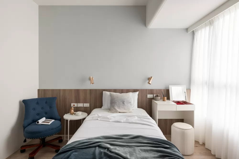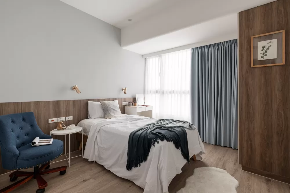 礙於空間規模,臥房部分也不做過多的裝潢,床頭處作了木皮腰板,視覺上更沉穩,抗污性也更佳。臥床兩側也僅以簡約的家具取代木作,保留未來變化的彈性。