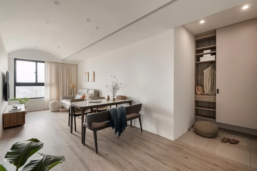 公領域偏窄的「豎廳」格局,採取開放式設計,以家具區分客、餐廳空間,這裡的裝潢也不做多,以家具櫃體取代木作,保留充分的活動空間。沙發上方原有大樑貫穿天花,設計師則巧妙以弧型拼接,既創造高度,又修飾樑下壓力,同時嵌入燈帶,讓空間溫暖舒適。