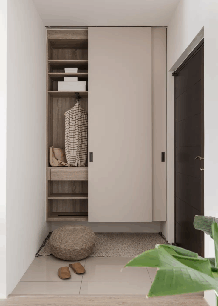 設計團隊巧妙運用進門處的深度與高度,打造綜合式的收納櫃體。除了鞋子層架外,在不同高度嵌入抽屜、吊掛衣桿及上方置物區,而底端作了懸浮設計,方便進屋時鞋子的暫時置換。