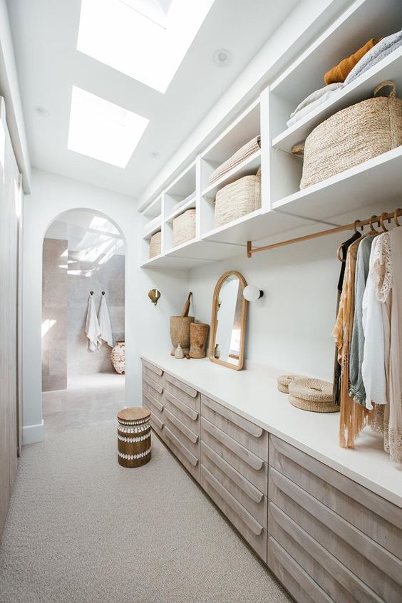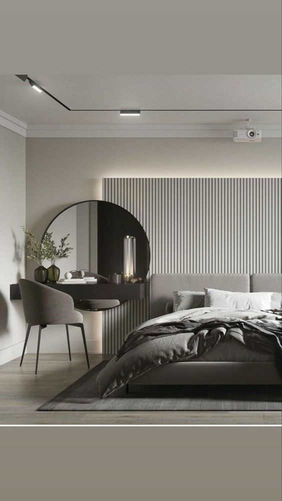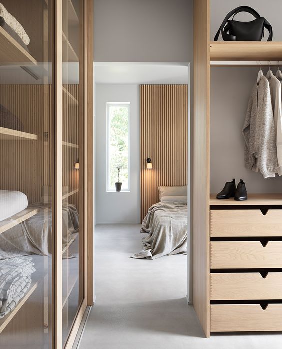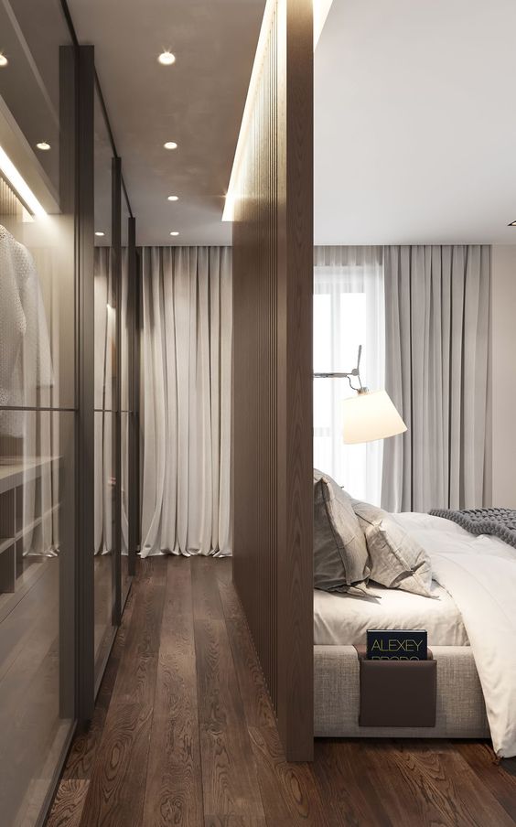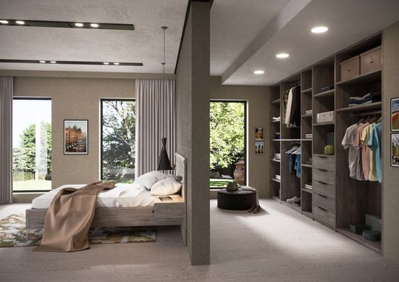 許多主臥房喜歡有主人的更衣室。其實這在我們做設計上,我們會考慮滿多面向,包含空間的合適性 大小 隔局是否合適。而在更衣室設計中,我們是有需求 喜歡 想要,這都是設計者要為客戶全盤思考的方向。格局是否得宜,更衣室是否需要隔開,減少灰塵。通常來說,我們考慮好床的坐向後,會試著配置更衣室所需空間,最少都要衣櫃的深度60公分+走道空間60公分。所以我們認為最少都要適當安排一個深度110~120公分的尺度以上,才有做更衣室的考量。不然我們都會建議,以現在的房間做隱藏式的收納,空間不可擁擠,來達到放鬆區劃的設計。