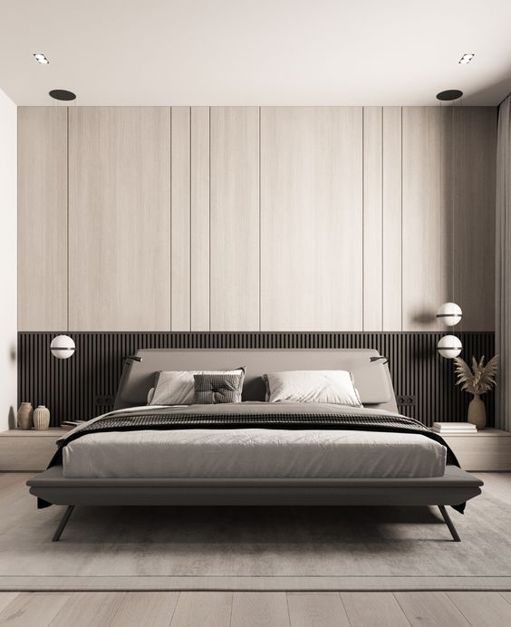 - 床頭牆面做異材質的表現手法,壁紙 繃布 貼木皮各式的表現手法。或以單純的牆面色做圖塊的分割,也能呈現俐落的手法。另外拉長線條的分割也能呈現看似天花板較高的感覺。織布品會讓人有俐落高雅的氛圍。