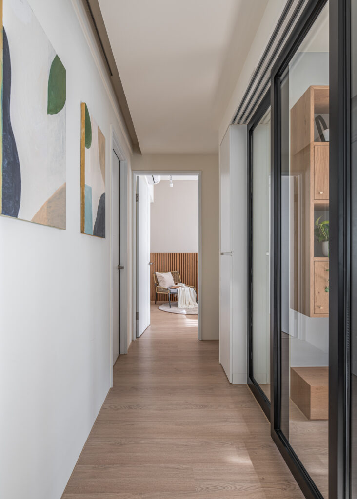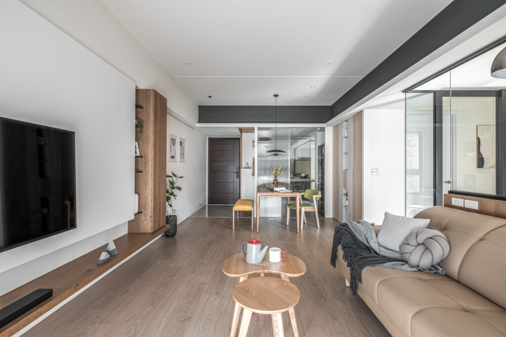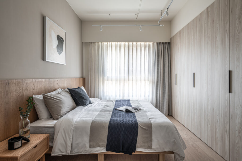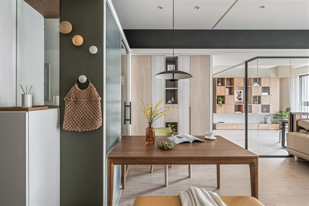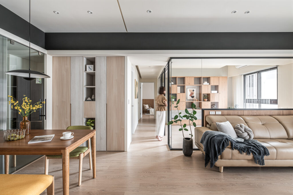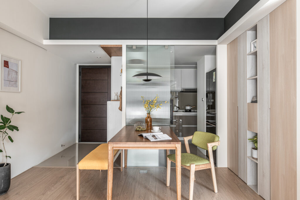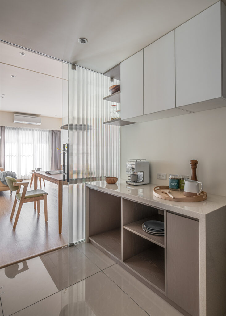 The kitchen’s sliding door design, along with the glass panels at the entrance, invite light into the room, simultaneously fostering interaction among family members during entry and cooking. In the private domain, a gray-toned base complements the wooden headboard, evoking a Zen-like tranquility from solidity to void. Through the gradually shifting layers of light and shadow throughout the space, life is imbued with a particularly soothing depth and flavor.