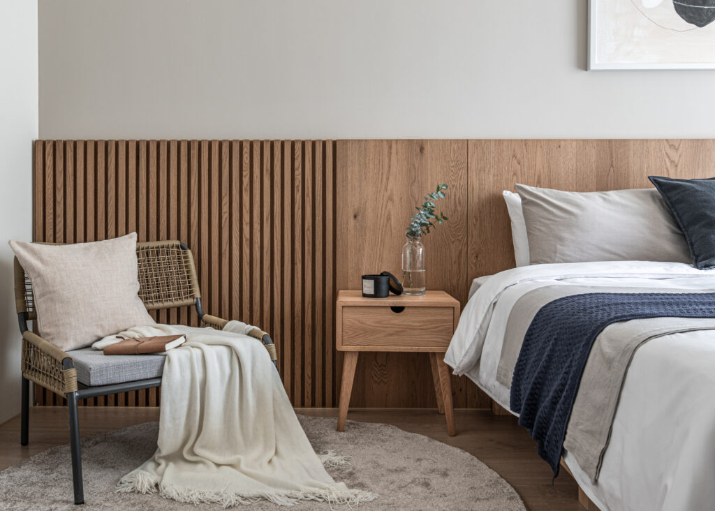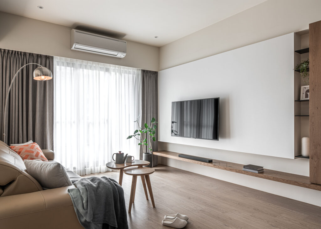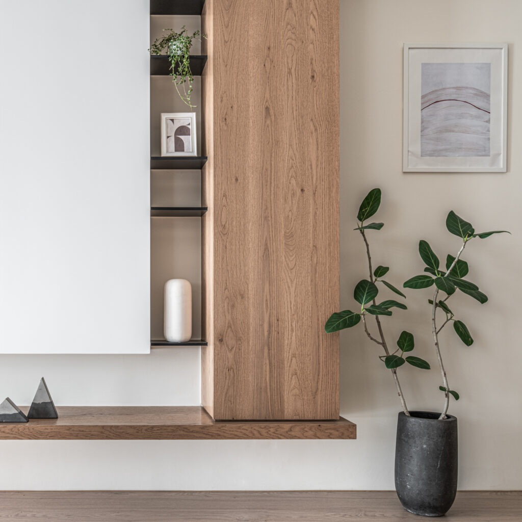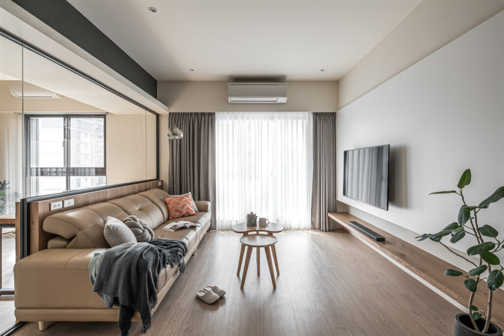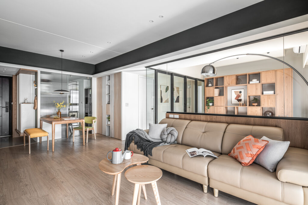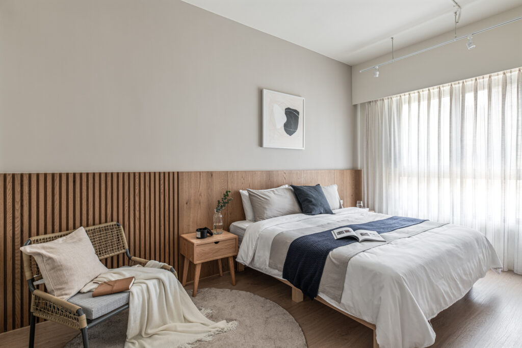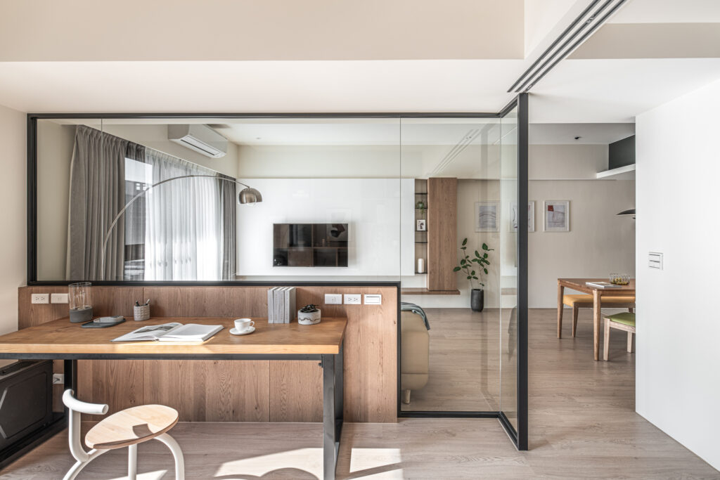 The kitchen’s sliding door design, along with the glass panels at the entrance, invite light into the room, simultaneously fostering interaction among family members during entry and cooking. In the private domain, a gray-toned base complements the wooden headboard, evoking a Zen-like tranquility from solidity to void. Through the gradually shifting layers of light and shadow throughout the space, life is imbued with a particularly soothing depth and flavor.
