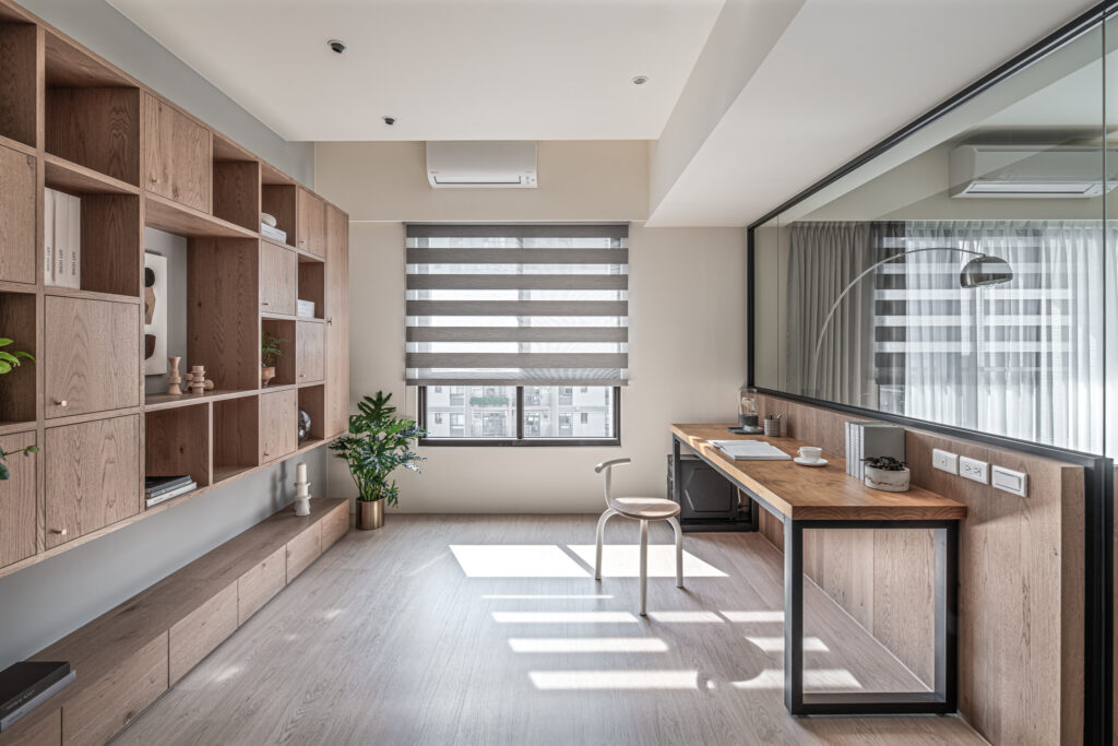 This case concerns the planning of a new single-story residential dwelling, with an approximate indoor area of 116 square meters. The spatial orientation belongs to the west-facing direction, and the flat layout also obscures the corridor from light. In the initial planning, the orientation was adapted from sunlight to daylight advantages. This was achieved through the extensive use of transparent materials, integrating the client’s home office needs and their preference for Japanese aesthetics, thus forming the central idea throughout the entire project.